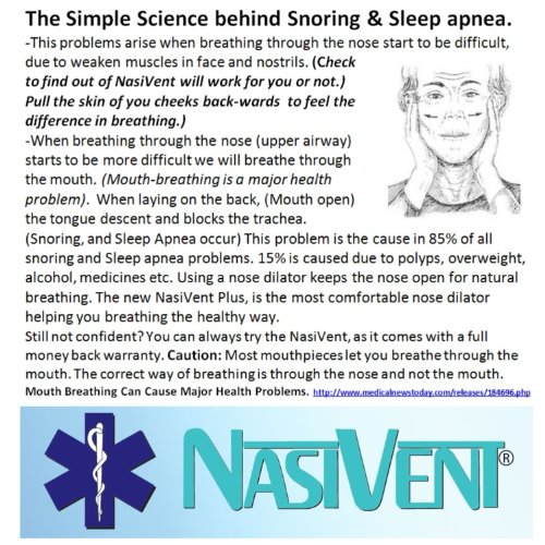 How it really works: While sleeping on the side, using the soft comfortable NasiVent Tube, breathing through the nose, the tongue will rest to the palate. A "Natural light vacuum seal" will be created with the (soft palate). No sound occurs as the mouth is closed and the tongue can't block or clog the trachea (windpipe) anymore, as by sleeping on the back while mouth breathing. THE ORIGINAL NASIVENT IS MEDICAL ERGONOMIC DESIGNED WITH THE HOLD-FAST IN THE TIP OF THE NOSE.