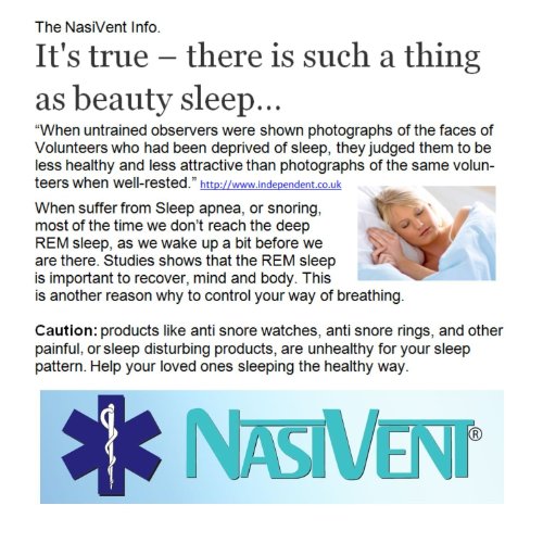 People who use dental prosthesis, are advised to take out while sleeping as it can influence above results in an negative way. For those who are new to snoring: Snoring is for 85% caused due to obstruction of the upper airways (the nose). Other causes of obstruction of the upper airways can be overweight, wrong medicine, alcohol, enlarged polyps etc. In most cases NasiVent can help. Note: When you may need a nose dilator, you better get the most comfortable one, as you will probably use it for the rest of your life. WE BREATH APPROXIMATELY "6000" TIMES A NIGHT (based on 8 hours sleep): The effect of too much air intake due to "over widened" nostrils or "Mouth Breathing" using mouthpieces, can have a harmful effect on the condition of the total body and mind.