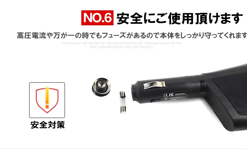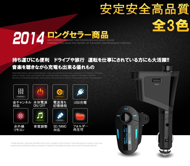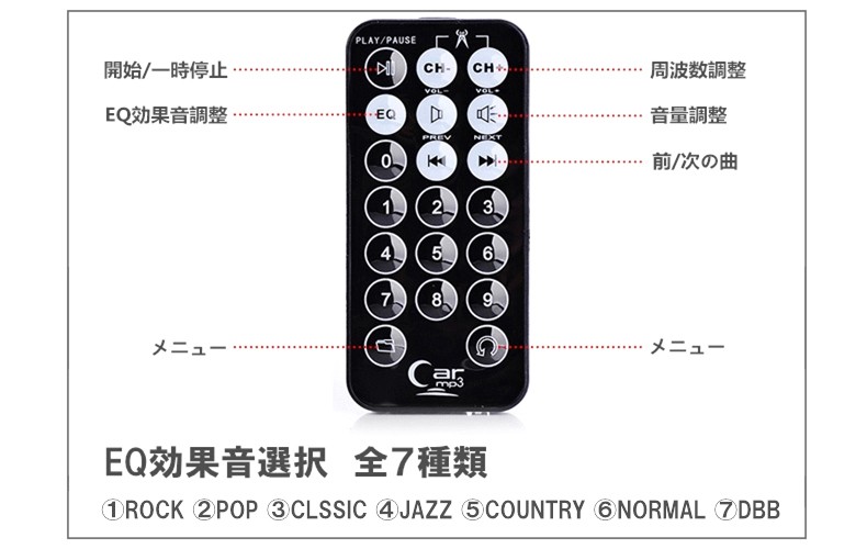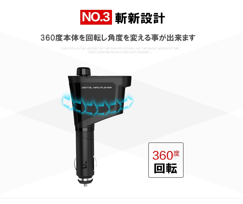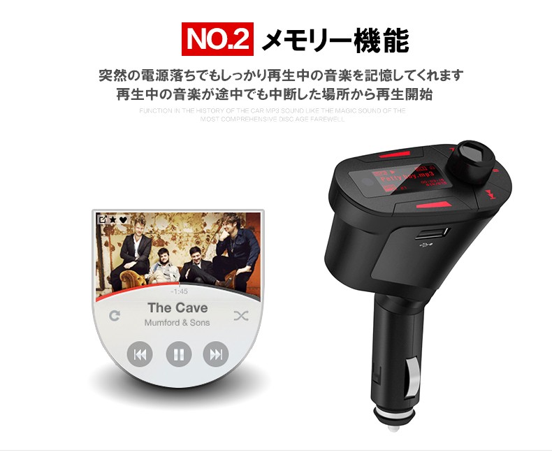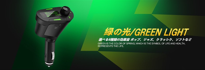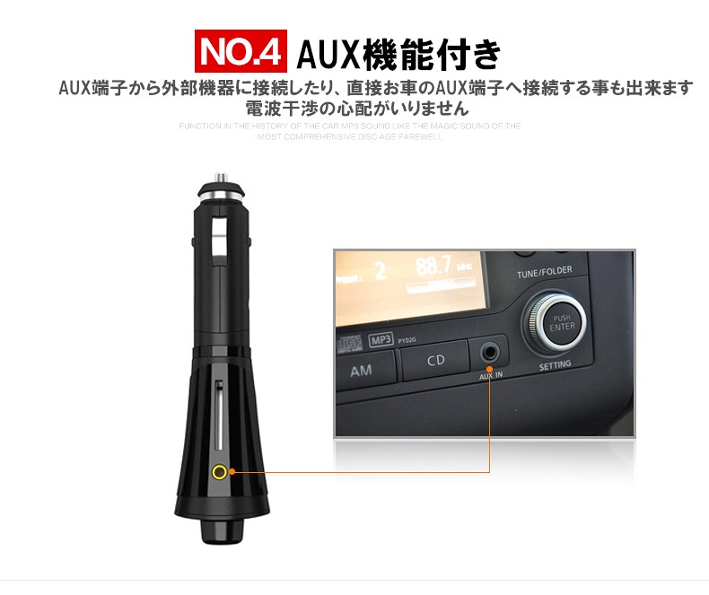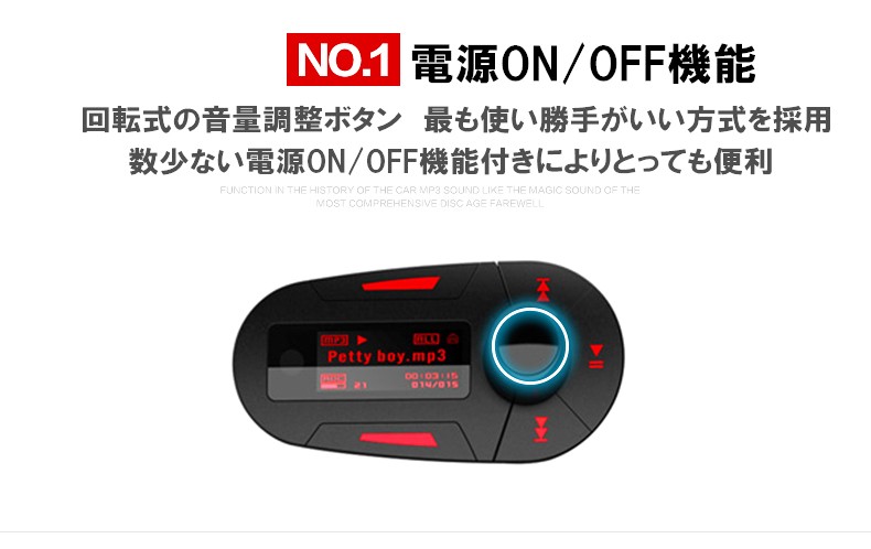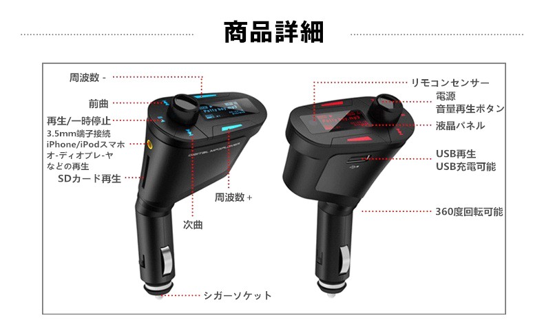 付属品: 日本語マニュアル、リモコン、オーディオケーブル、ヒューズ使用電圧: DC9V-24V、対応ファイル: MP3/WMA、作業電流: 60-70mAFMトランスミッターの周波数: 87.5-108.0MHz、動作温度: 0~60 度、有効距離:5m以内本体色: 黒、寸法:(6.7 x 6 ) cm(L x W )USB2.0 ポート、LCD screen (128*64)、3.5mmオーディオ入力※USBメモリとSDカードの相性が悪い場合は使用できない場合がございます。MP3ファイルを保存したUSB/SDフラッシュメモリーを接続するだけで、すぐに音楽を聴くことができる車載用FMトランスミッターです。スイッチボタンを押すだけで使用開始、操作は極めて簡単です!最も使いやすい回転式の音量調整ボタンも配置!最大8GBまでのSDカード/MMCに対応、USB2.0 ポートで、交信スピードがとっても速いです!360度回転できる綺麗な3色の液晶をご用意しております!7内蔵等化器:標準、ROCK, POP, CLASSIC, Country, JAZZ, DBB、音質を自分好みにセットできます。【注意】※360度回転はシガーソケット部を回すのではなく、シガーソケット部を固定して回転部を回してください ※商品は日本語説明書を付属しています。