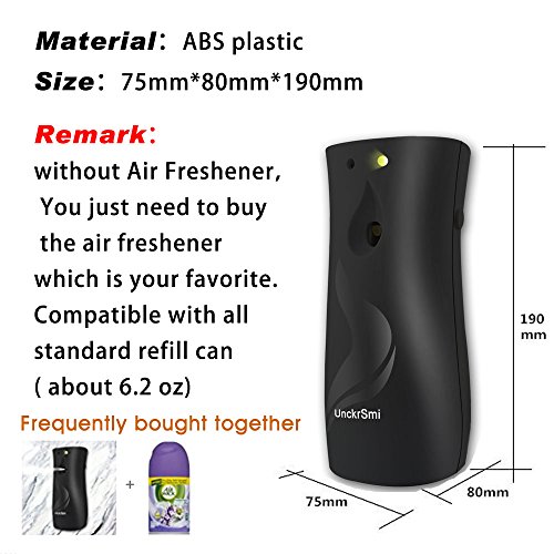 ? In The Box: 1 Automatic Air Freshener Dispenser and giveaways 2 batteries and setscrew. (without Air Freshener spay refill) This item also needs the universal refills, ? Refills:6.2 oz refills are standard and universal, almost all the Glade and Air Wick refills fit this, or the dimensions about 2.6 x 2.6 x 5.5 inches, Frequently bought together ? In general, a standard about 6.2 oz refill can last about 45 days based on low setting, for example, 1 spray per 15 minutes and "day" mode (Light Control Function). ? It couldn't work well on low energy, so please replace the battery at that time.