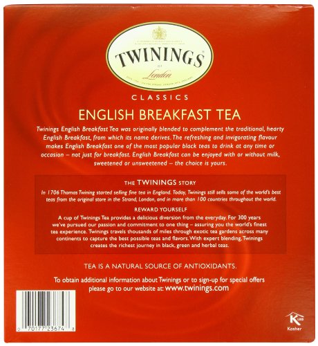 Twinings English Breakfast Tea was originally blended to complement the traditional, hearty English Breakfast, from which its name derives. The refreshing and invigorating flavour makes English Breakfast one of the most popular black teas to drink at any time or occasion, not just for breakfast. English Breakfast can be enjoyed with or without milk, sweetened or unsweetened—the choice is yours.Feature