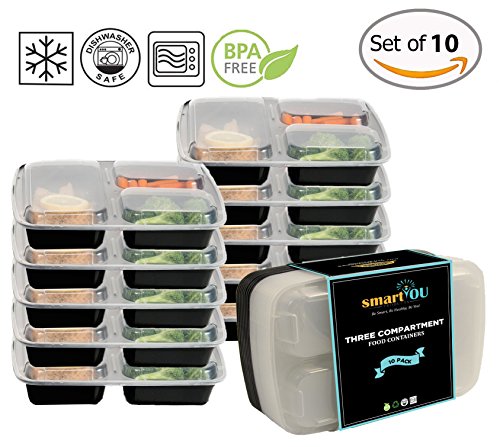 3-Compartment Bento Lunch Box / Sturdy Plastic Food Containers (Set of 10) with Leakproof Lids for Kids and Adults by smartYOU - Perfect to use for Meal Prep, 21 Day Fix, and Portion Control