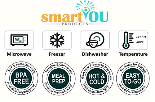 ★ PREMIUM QUALITY! - smartYOU Meal Prep Containers are FDA Certified! You can rest assure that our food storage containers are dishwasher, microwave, refrigerator, and even freezer safe. They are designed to endure even the toughest of situations, and are 100% stackable with or without food to allow for easy storage in the cabinet, refrigerator, or travel when taking meals on the go.