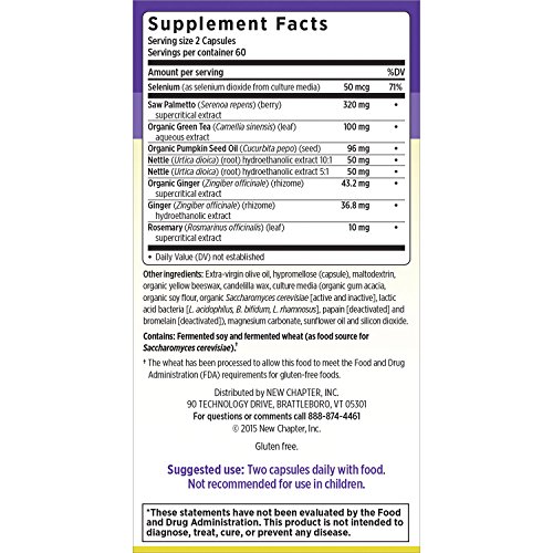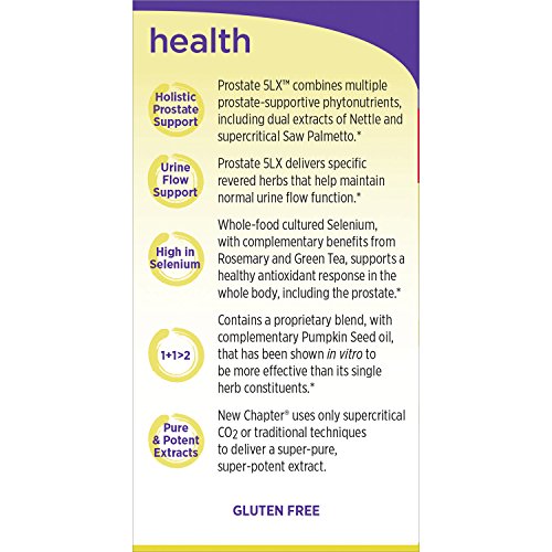 Prostate 5LX is a daily prostate supplement expertly formulated to support normal urine flow and overall prostate health.* It combines multiple prostate-supportive plant nutrients from Nettle, clinical strength Saw Palmetto, Pumpkin Seed, and other potent herbs.* New Chapter’s premier prostate supplement is also rich in fermented Selenium, a key mineral for men. The benefits of New Chapter’s Prostate 5LX add up to a comprehensive men's formula that supports your quality of life—day and night.*Feature