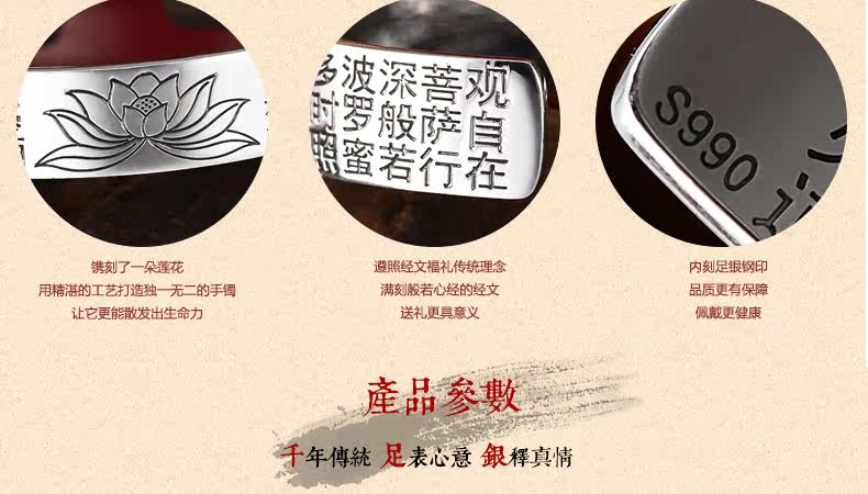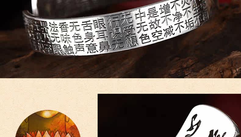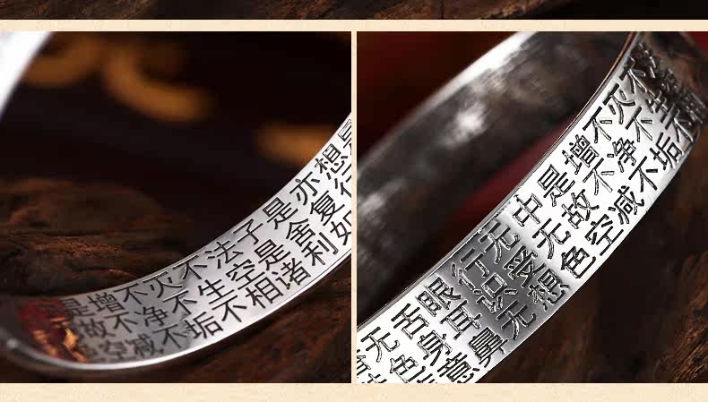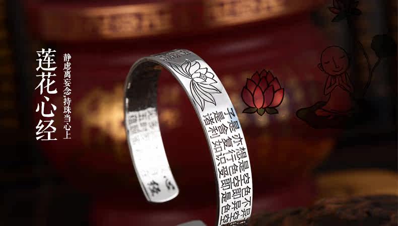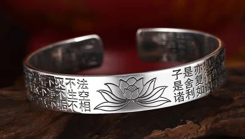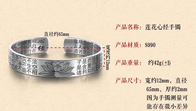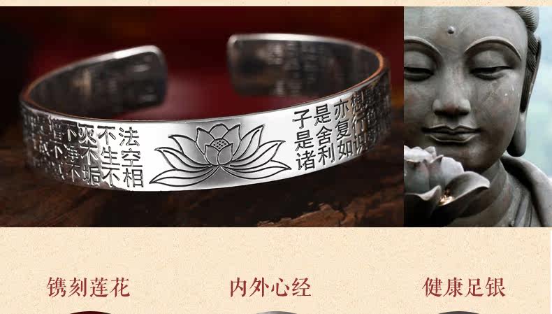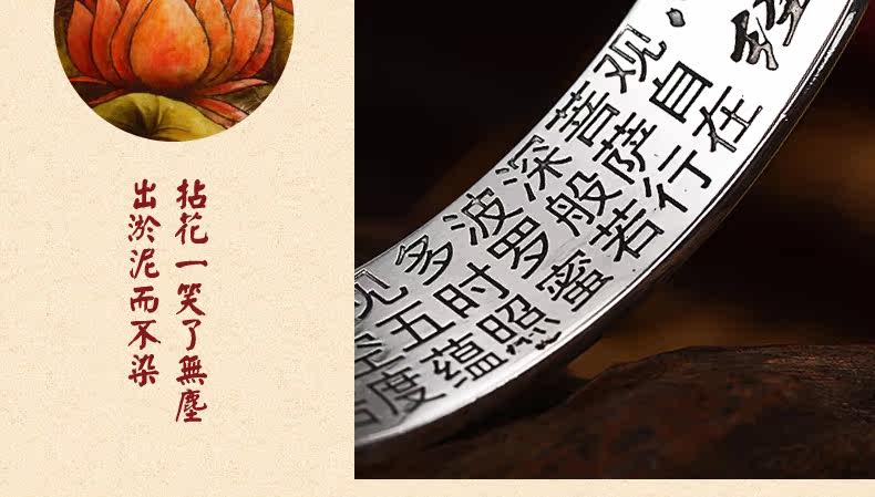 | 名 称:足银/莲花心经手镯 | 材 质 :S990足银 | 重约:42g(少克重补差价) |