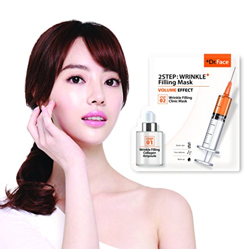 -. Feature : • The '2 Step Wrinkle Filling Mask' is optimized for hydrating, improving fine wrinkles, and lifting up face. (Certified winkle functioning cosmetic) / • Wrinkle Filling Collagen Ampoule (Step 1) gives strong elasticity and moist to skin with 2.5g of rich essence that consists of Collagen Peptide, Co-Enzyme Q10, and hyaluronic acid, so called a moisture magnet. / • Wrinkle Filling Clinic Mask (Step 2) gives additional elasticity and firming effect to ageing and loosen skin. / • 1 package has 10 sheet mask and each contains 1,000 ppm of fish collagen (Hydrolyzed Collagen). / • Use of natural cellulose sheets and manufactured in Korea.