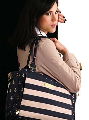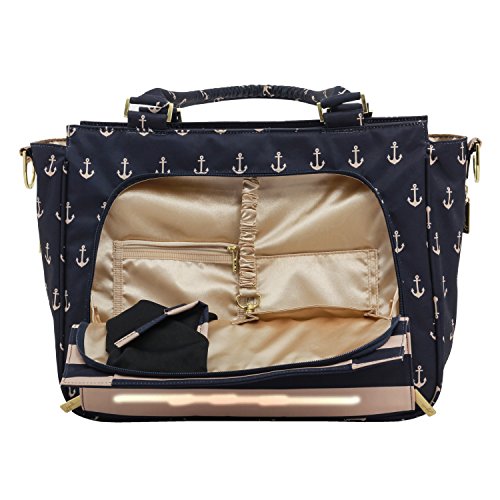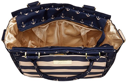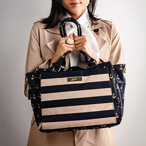 The Ju-Ju-Be Legacy Nautical Collection Be Classy Diaper Bag is like you - a class act. You might spend a majority of your days covered in baby food, or picking up the playroom for the 100th time, but have no doubt: you are still the same classy woman you have always been and will always be. Which is why we want to thank you for the inspiration behind this bag design. Thanks to the feedback from our talented fan base we were able to create the Be Classy: a bag that is a testament to the spirit of the Pink Ladies that make Ju-Ju-Be great, and the standard to which we always strive. A bag that is not only one of our most functional, tailored designs, but also possibly the most timeless. With its sleek design and adjustable messenger strap or structured handbag style carrying options, the Be Classy is the perfect culmination of your favorited Ju-Ju-Be features. A bag so functional you will bring it on your first outing with your newborn, and one so elegant you will carry it well after the diapering days are done. The bag's lining is protected with Agion natural antimicrobial treatment, which inhibits and reduces the growth of odor-causing bacteria, mold and mildew. The outer fabric is treated with Teflon fabric protector, so you can repel stains and keep it clean. The front "mommy" pocket holds keys with a stretch key fob and sunglasses (cleans lenses too.) with plenty of room for more. The main zipper pocket is large enough for diapers, wipes, extra clothes and other items. Keep organized inside with (3) gusseted pockets and (1) zippered pocket. The back pocket is designed with crumb drains to keep this area clean and includes a super cushy memory foam changing pad. The (2) bottle pockets are located on either side of the bag and insulated with Insulate to keep items warm or cold. The Commodore print is navy and tan stripes and anchors with tan lining. The print is accented by gold, metal hardware, including luggage feet to keep the bottom of your bag clean when you set it down. All Ju-Ju-Be Bags come with a Lifetime Limited Warranty against manufacturing defects when purchased from an Authorized Ju-Ju-Be Dealer. Authorized Dealers can be found in the images. Founded in 2005, Ju-Ju-Be is a Southern California company that uses science, style, and attitude to create diaper bags, purses and other fashionable accessories. Ju-Ju-Be assimilated the most advanced technology possible to create a stylish and intelligent product line that's unrivaled in the industry.Feature