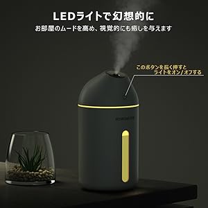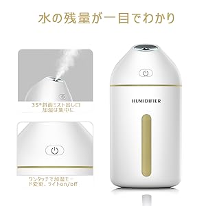 純白のシンプル設計によって、スタイリッシュで場所も取らずにいい感じです。暖かい黄色のLEDライトが付き、視覚的に癒しを与えます。(ボタンを長く押しとライトのオン/オフがコントロールできます)