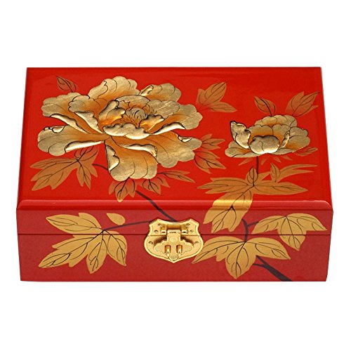 -. Title : Chinese style Wooden Jewelry box Treasure Chest Case with Lock Golden Peony Red