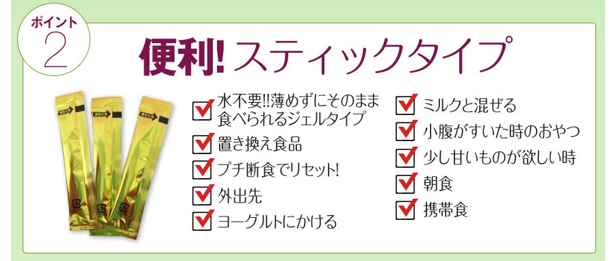 | 商品説明 | キレイもスッキリも♪”活きている”美活酵素 白砂糖一切不使用!自然の甘みがくせになるおいしさ♪ 便利なスティックタイプ!生きた酵素で善玉菌チャージ! |
