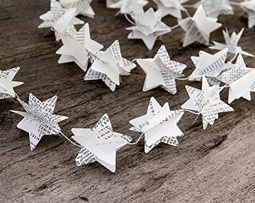 1 strand contains: star shaped pieces, die cut from old book, all sewn together with white thread. Each garland has small white satin ribbon hanging and is made to order from the similiar materials.