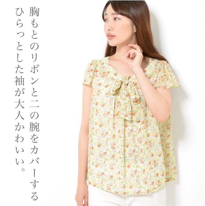 胸もとのリボンと二の腕をカバーするひらっとした袖が大人かわいい。