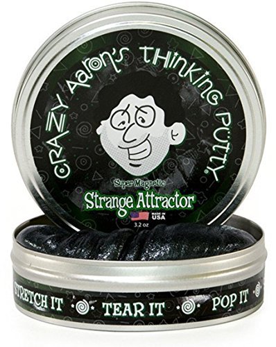 Strange attractor is the name of a mathematical equation that is commonly part of chaos theory. This equation creates a fractal-a never ending, non-repeating pattern within a dynamic system. Basically, a strange attractor has a mind of its own and creates beautiful patterns in design, art, and nature. Strange Attractor Thinking Putty has a mind of its own as well. A deep, mysterious black with subtle green sparkles, it comes alive when charged with the included magnet. Each tin includes 1/5 lb of Strange Attractor Thinking Putty-a huge handful for tons of fun-a 1" x 1" ceramic magnet.Feature