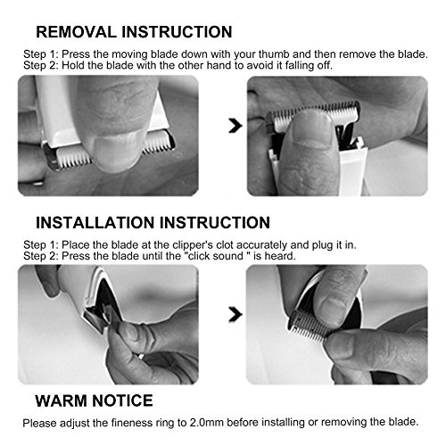 ★【High quality Titanium Sharp Blade】: High quality Titanium blade and moving blade can provide excellent cutting performance,Not get hot with long time use. And detachable blades for ease of changing and cleaning : set the collar setting to 2.0mm,then hold the blade, push it down.