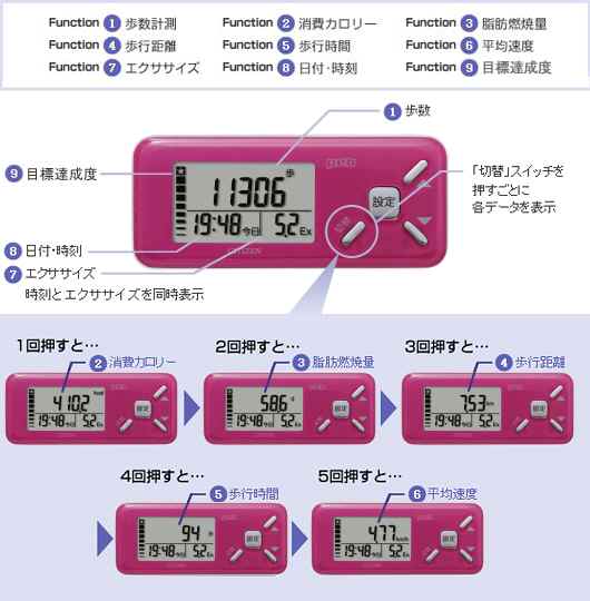 どの画面を表示していても、約15秒間スイッチを押さないと、歩数表示画面に自動的に戻ります。