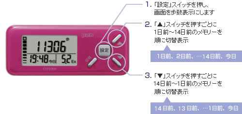 日々の歩数を比較しやすいように、14日分のデータを自動でメモリー。