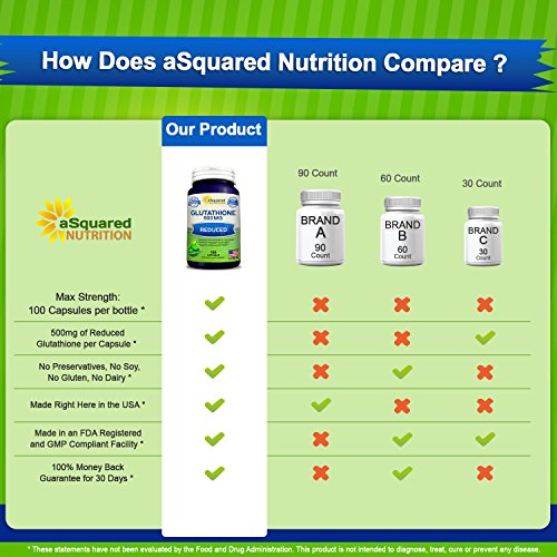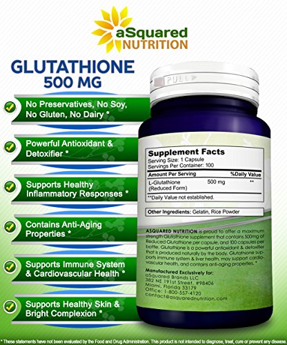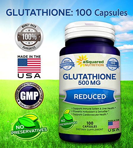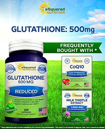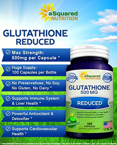 -. Feature : MAX STRENGTH GLUTATHIONE: aSquared Nutrition's maximum strength Glutathione supplement contains 500mg of reduced Glutathione per capsule, and 100 capsules in each bottle. Glutathione is a powerful antioxidant found in human cells that is essential for detoxification and natural immune defense. Don't settle for other tablets or pills that only offer 250mg of Glutathione (GSH) per dose, or that only give you 60 or 90 capsules per bottle. * / AMAZING ANTIOXIDANT PROPERTIES: Reduced Glutathione (GSH) is composed of three amino acids: Cysteine, Glutamate, and Glycine. Glutathione plays an important role in reducing oxidative stress caused by free radicals, lipid peroxides, and heavy metals. Additionally, Glutathione supports immune system and liver health, helps detox the body, supports healthy inflammatory responses, & supports cardiovascular health. * / SKIN HEALTH & ANTI-AGING: Increased levels of Glutathione can help slow the aging process, as Glutathione is essential for combating free radicals and reducing oxidative stress. In addition to promoting cellular health, L-Glutathione has powerful anti-aging and antioxidant properties. It supports healthy skin & nails, may help brighten your skin and complexion, and is often used for skin whitening. * / BEST VALUE ON AMAZON: Our reduced L-Glutathione 500mg formula is backed by our 100% Money Back Guarantee for 30 Days. Each bottle contains 100 Glutathione capsules, and is made in the USA, in an FDA registered and GMP compliant facility. Our potent complex contains No Preservatives, No Soy, No Gluten, No Dairy, & No unnecessary fillers or binders. Also try our Methyl B12, CoQ10 (Coenzyme Q10) 200mg or 400mg, Milk Thistle, all natural Turmeric Curcumin, Resveratrol 1000mg, & SAM-e. * / COMMON NAMES & FORMS: Glutathione, aka L-Glutathione or Glutathione (GSH), is almost always in its reduced form when found in supplement formulas. It is a natural substance in the human body that is composed of the amino acids cysteine, glycine and glutamic acid. Glutathione can be found in capsules, soft gels, pills, tablets, powder, liposomal form, soap, spray, drops, droplets, liquid, or cream. Try also our CoQ10 (Coenzyme Q10) 400mg, Methyl Vitamin B12, Resveratrol, and SAM-e 500mg. *