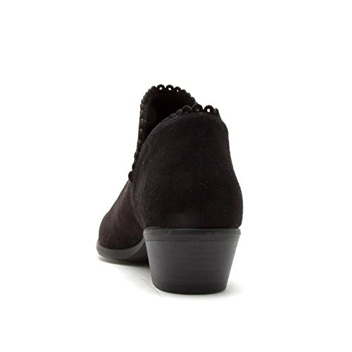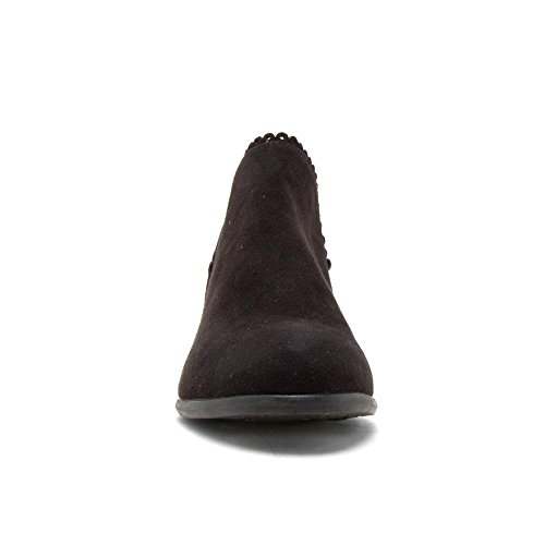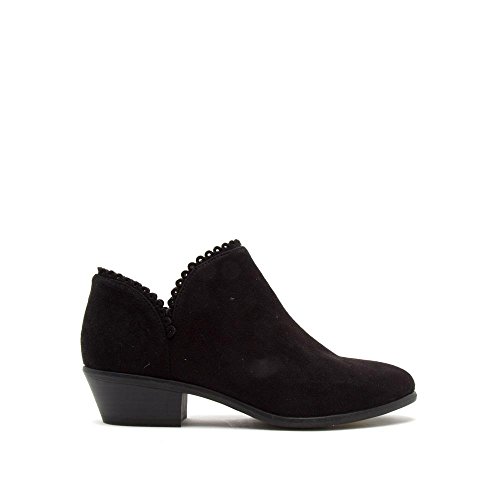 Product Description We're a sucker for classic booties with unique girly details! A pair of faux suede almond toe ankle booties featuring an ankle cut out with a scalloped edge and low stacked heel. 0