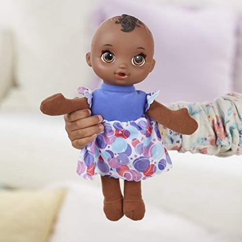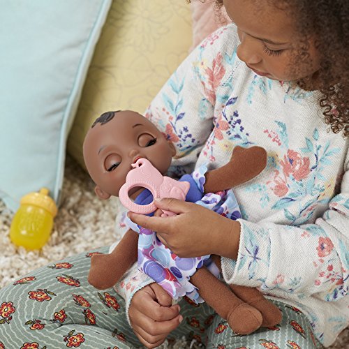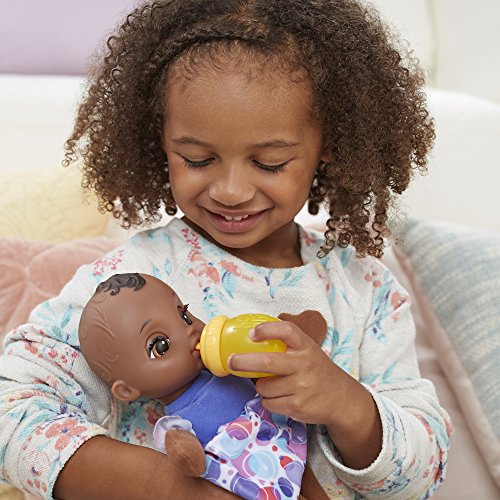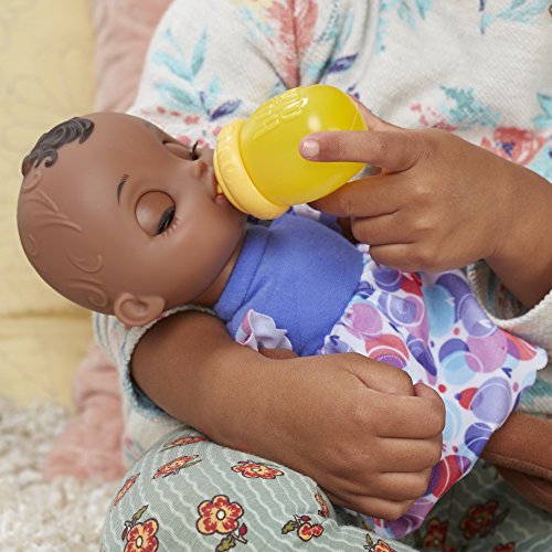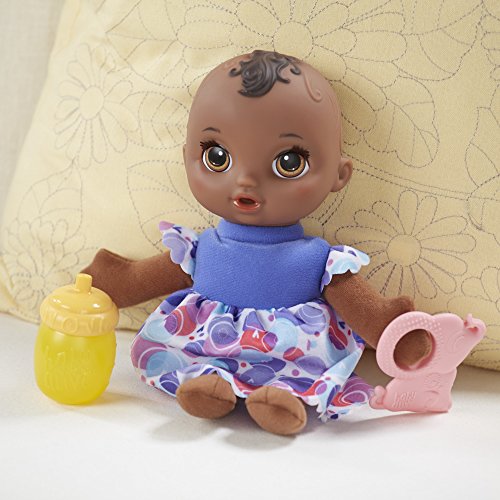 The Baby Alive Lil' Slumbers doll is a sleepy baby that girls and boys can rock in their arms and take care of like a real baby! Cradle the Lil' Slumbers doll or lay her down for a nap and her eyes will close shut! Girls and boys can hold her upright, like they're feeding, burping, and cuddling her, and her eyes open again. Girls and boys can pretend to feed her with the included bottle and comfort her with her adorable, elephant-shaped teething ring, too. With a soft body for snuggling, the Lil' Slumbers doll is the perfect first baby for early Baby Alive fans to act out nurturing play and begin to create their fun world of mommy and daddy moments. Baby Alive and all related properties are trademarks of Hasbro.Feature