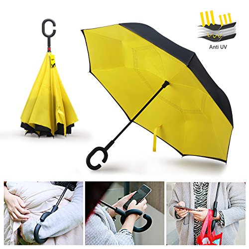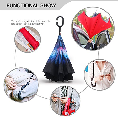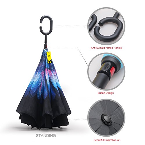 -. Binding : Misc. -. Feature : REVERSE DESIGNED for easy to get in the car on rainy day, better for keep you drying, because it just need a little space to open or close when you get in or get out of the car on the rainy day / DOUBLE LAYER CLOTH design is better for keep dry for car or floor, when you close umbrella and get into car, because when you closed, the outside will become inside / BIG ENOUGH: Measures 81cm long and 106cm in diameter when open.Large enough for two people huddled together / Easy to operate; Hold the button and push upwards and it will open. / It can stand by itself, when not held tight by the velcro close strap. MONEY BACK GUARANTEE. -. IsAutographed : 0 -. IsMemorabilia : 0 -. ProductGroup : Sports -. ProductTypeName : SPORTING_GOODS -. Title : MOZON Double Layer Reverse umbrella for Windproof & UV protection