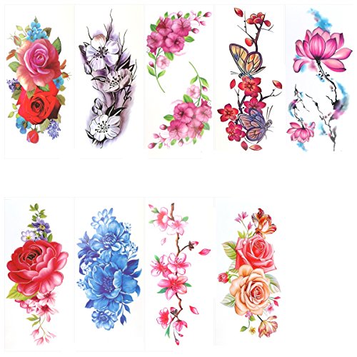 Package Including 9 * Sheets Temporary Tattoo Rose Peony Flower Butterfly Lotus Cherry Blossoms Flash Tattoo for Women 0