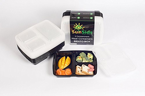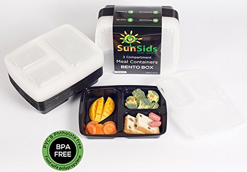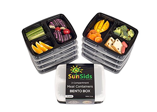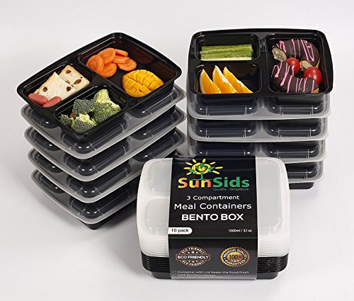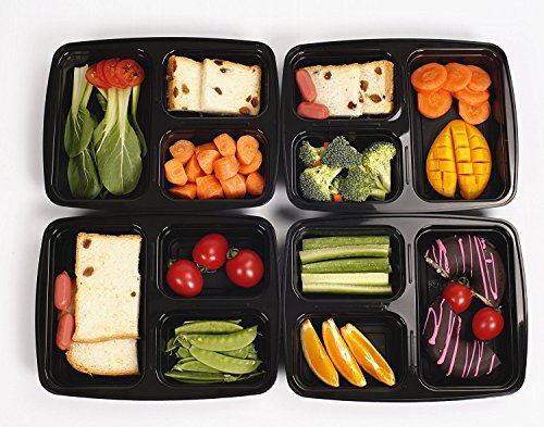 A COMPLETE MEAL IN ONE BOX, PORTION CONTROLLED: This 10-Pack set of food containers (black base with clear lid) features 3 different compartments so you can take with you a complete meal just in one container. Use them for your main course, salad and dessert and enjoy your meal everywhere, hassle free. Each meal prep container can store a total of 32oz (two smaller and one bigger portion) which are the perfectly controlled portions to stay full, yet fit and healthy!