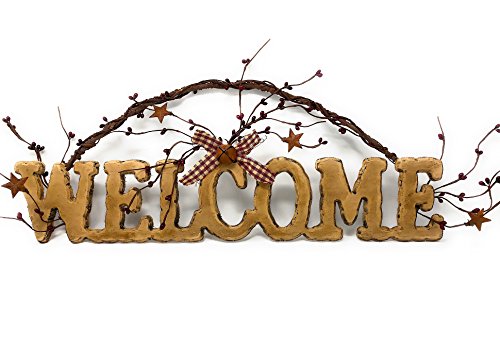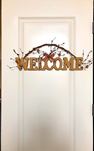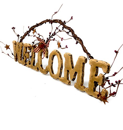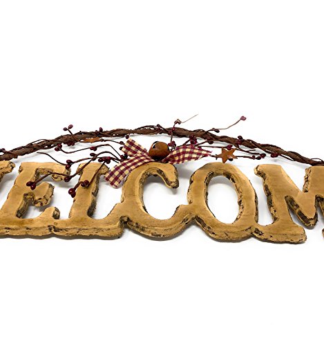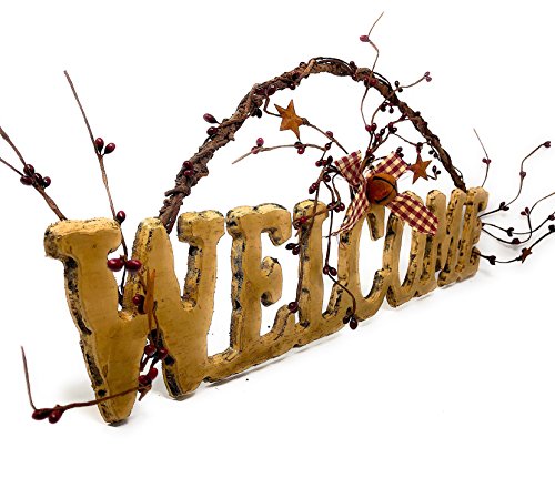 WELCOME RUSTIC SIGN: Featuring Beige Welcome wood sign for indoor or outdoor decor display. Made of quality-compressed wood with red color faux berries, rustic stars and gingham weave ribbon with a rustic bell in the middle.