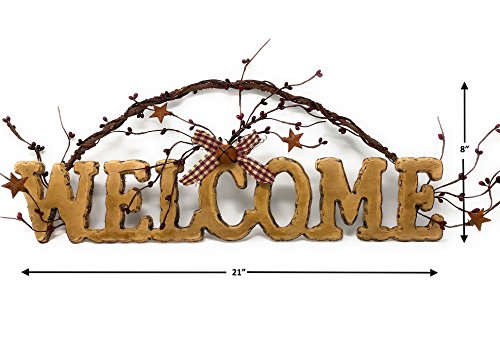 Welcome Rustic Sign With Berries Stars Indoor Outdoor Front Door Wall Decor (21” by 8”) (Beige & Red)