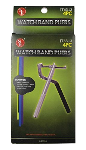 Studio : Sona Enterprises Publisher : Sona Enterprises Binding : Tools Home Improvement Product Description SE is proud to present our Watchband Pliers. These pliers are great for resizing watches, bracelets, hobby crafts and other items that have removable pins. Features of our product include: (1) 3 different sized pins included: 0.8mm, 0.9mm, 1.0mm (2) Pin length: 1.75 inch (3) Maximum watchband width: .75 inch (4) Removes round pins (5) Overall length: 6.25" SE is committed to providing the customer with the best source for value possible on the market. You will enjoy the quality, function and usefulness this Watchband Plier has to offer. SE is a registered trademark protected by US Trademark Law. . 0