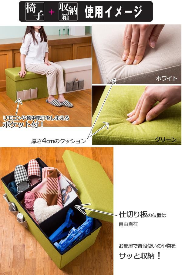 小物を収納できるイスです。リビングやオットマン、ドレッサーチェアや子供部屋など、あらゆる場面で活躍!!リモコンや懐中電灯などをしまえるポケットもついています。好きな位置に装着できる仕切り板付なので、箱の中もきちんと整頓できます。ワイドタイプです。 |