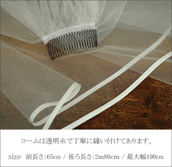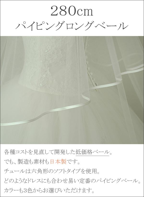 式場レンタルよりおすすめです。 式場でレンタルの場合、無地ロングで1万円、パイピングロングになると2万円と言われ挙式の20分間しか使わないものに勿体ないとあきらめかけていました。 こちらのショップの商品は式場の物より繊細なレースで、長さは2・5メートルと通常のロングより短めでしたが、背の低い私には充分で、ドレスより少し長くバランスもちょうど良いと感じました。 まさかこんなに安く購入出きるとは思っていませんでしたが、諦めずに探して良かったです!! 発送もとても迅速で、簡易包装でもシワなど入っていませんでした。 Amazonや個人販売でも探しましたが、日本製でここまで安いものはありませんでした。 |
