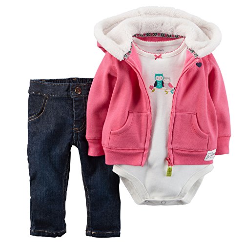 -. Feature : 3-piece set / Sugar glitter screen-P.R.Inted owls and Sherpa-lined hood / No-pinch elastic waistband / Cardigan: 80% cotton, 20% polyester, Bodysuit: 100% cotton, Jeans: 99% cotton, 1% elastane / Machine washable