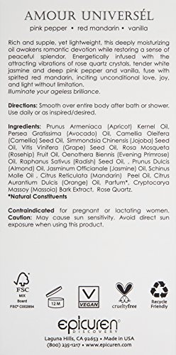 Rich and supple, yet lightweight, this deeply moisturizing oil awakens romantic devotion while restoring a sense of peaceful splendor. Energetically infused with the attracting vibrations of rose quartz crystals, tender white jasmine and deep pink pepper and vanilla, fuse with spirited red mandarin, inciting unconditional love, joy, and light without limitation. Illuminate your ageless brilliance with this nourishing body fragrance.Feature
