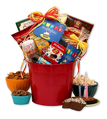 -. Feature : Includes: 9" galvanized red pail, Chocolate cupcake cookies with sprinkles, chocolate hot fudge brownie, Munchies cheese snack mix, Pizza and beer cheese biscuits, 1.6 oz Jelly Belly 20 most popular flavor Jelly Beans, hot buffalo wing pretzel nuggets, 3 oz Bavaria summer sausage, musical birthday candle, Happy Birthday bag of tropical trail mix, 1.2 oz white cheddar popcorn, Wonderful roasted and salted almonds. Completed measures 9" round and 15" tall, is wrapped in cellophane and topped with a hand tied bow and Birthday card.