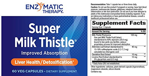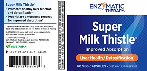 ReleaseDate : 2008-02-08 Studio : Enzymatic Therapy Publisher : Enzymatic Therapy Binding : Health and Beauty Product Description Super Milk Thistle 60 CapsuleProduct Description Why take milk thistle extract? It provides natural support for your liver in multiple ways - Silymarin is the key component in milk thistle extract for supporting your liver, plus helping other body systems (intestines, gall bladder, circulatory and lymphatic systems) detoxify, getting rid of the bad stuff that can affect your health. Why take Simply Milk Thistle?It provides natural liver support, plus strong antioxidant protection - Simply Milk Thistle is standardized for silymarin, a group of compounds that have a tremendous effect in protecting the liver and supporting detoxification processes.* But detoxification is only part of the overall picture - milk thistle extract also acts as an antioxidant - many times more potent than vitamins C and E*
