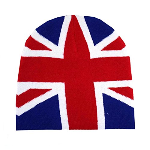 Product DescriptionBritish flag beanie. Flat knit beanie with red, white and blue graphics. Acrylic.0