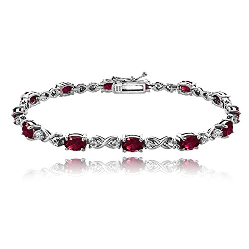 The perfect addition to any jewelry collection, this stunning bracelet for women and teen girls features 6x4mm oval-cut gemstones with contrasting infinity symbols studded with dazzling white topaz gemstones. This beautiful bracelet is crafted of .925 sterling silver and is nickel & tarnish free. The bracelet secures with a box with tongue and safety latch.