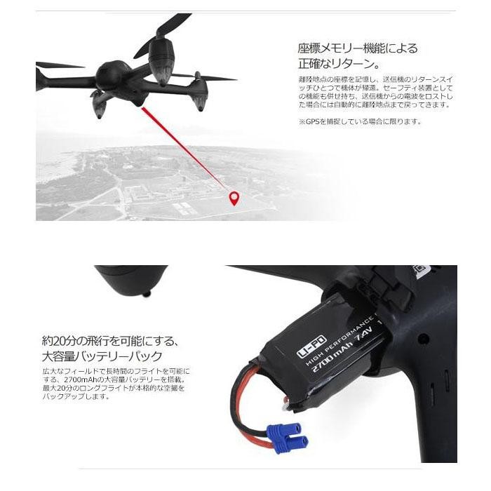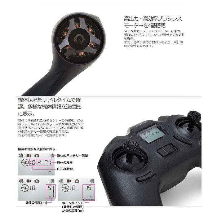 屋外でのフライトに適した、高出力・高効率ブラシレスモーターを採用。大容量7.4V 2700mAhバッテリーを搭載し、約20分のロングフライトを実現。また、信号が途絶えると、自動で帰還するフェイルセーフ機能が付いています。 |