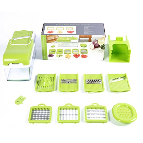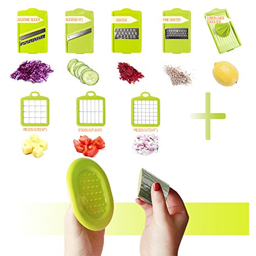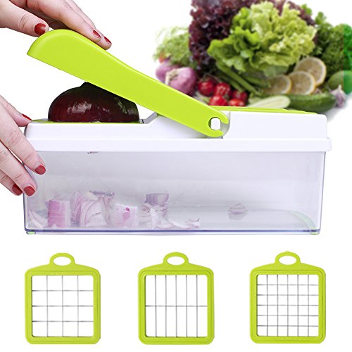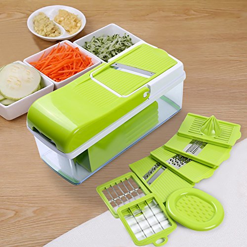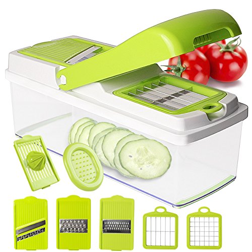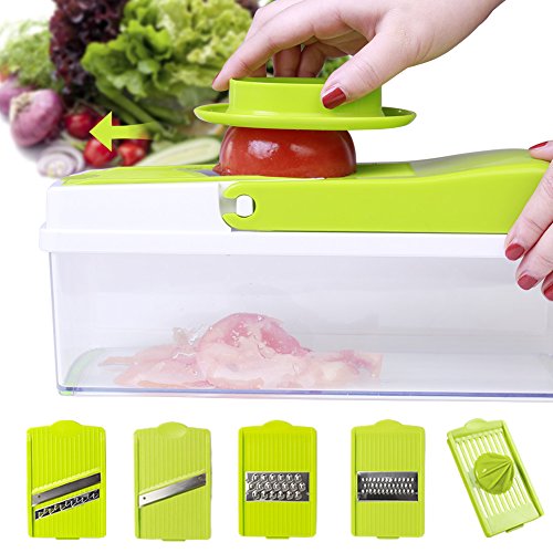 Features: -Various functions, perfect for vegetables/ fruits/ cheese. You can slice, dice, cut, julienne, cube, grate, wedge and so much more, help you to complete various dishes. -Sharp adjustable stainless steel blades help you cut vegetables quickly and nicely. -The huge size container can store your food at any time,?reduce the onion vapors?to minimize tears. -Blades rest can collect all the blades, and you can put all of this to the base container, save the space and reduce the possibility of missing the blade. -The thickness of the blade size is not adjustable, so we have different thickness and diameter size of the blade. -Suggest use slicer but not dicer for hard veggie like carrots. -Especially suit for vegans salad lovers kitchen novice.