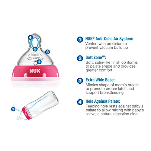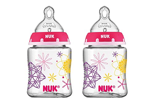 -. Feature : Natural shape supports combining breast and bottle feeding / Advanced Orthodontic Nipple fits baby's mouth like mom's when breastfeeding / NUK 1-piece Anti-colic Air System helps prevent colic, spit-up and gas / Easy to clean, dishwasher safe; Glass-like clarity, shatterproof / 5 Ounce; BPA free; 2 Pack