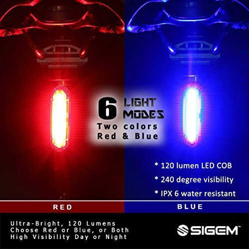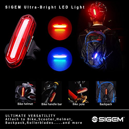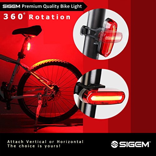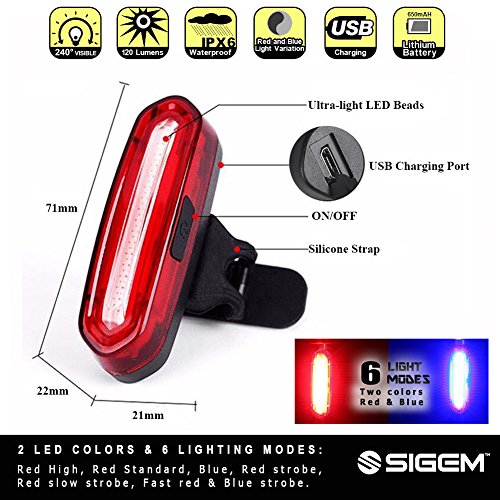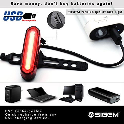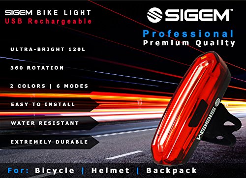 SIGEM - Premium Quality LED Bike Light (USB Rechargeable) SIGEM Ultra-Bright LED Bike Light.? All in one design bicycle light: Super bright 120 lumen output 6 lighting modes 240 degree visibility (Not 180°) USB Rechargeable, No wires or external batteries Light weight and durable design Water resistant IPX6 rating High-capacity lithium polymer battery (3.7V ?650 mAh) Can be used as a Bike Taillight, Headlight, Helmet light, and Backpack light. USB Rechargeable: Charges from your computer, Laptop or any device with a USB port. Smart Charging: 2 hour charging time (depending on charging device) Automatic, fully charged cut-off system Smart charging ensures longer battery life How to use: Press the Smart button for 2 seconds to switch ON or OFF. Press the button to select the desired mode. 2 LED Colors 6 lighting modes: Red Blue version:?Red High, Red Standard, Blue, Red strobe, Red slow strobe, Fast Red Blue strobe. ?? Mounting options: Horizontal or Vertical mounting. 360 Rotation. Rotate clockwise. WARNING: *Small parts. Not for children under 3 yrs. *Rotate clockwise *Ensure the screw at the back of the light is secured?tight regularly, as it can become loose if rotating anti-clockwise.? ? Package include: 1x SIGEM bike tail light with Silicon strap 1x USB cable 1x Retail box What are you waiting for? This special offer price is available for a limited time only and so place your order today. 0 |
