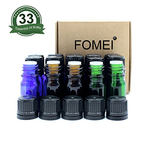 Fomei 33 Packs Oil Bottles for Essential Oils 5 ml Amber Glass Vials Bottles, with Orifice Reducers and Black Caps, With Plastic Transfer Eye droppers
