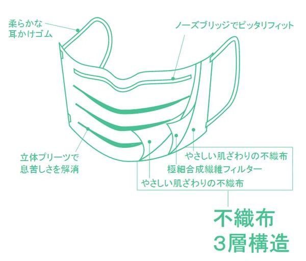 | 素材・材質 | 本体、フィルター部:ポリプロピレン ノーズブリッジ:鉄、ポリエチレン 耳ゴム部:ポリウレタン、ポリエステル |