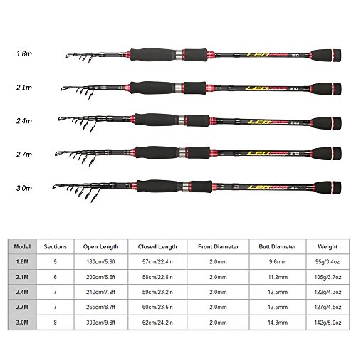 사양: 재질:탄소 섬유크기:1.8m / 2.1m / 2.4m / 2.7m / 3.0m(선택 옵션) 팩키지크기: 66 * 9 * 3cm / 팩키지의 중량:134g?182g / 팩키지 리스트: 1 *낚싯대