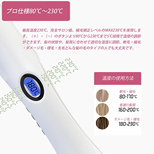 프로 사양80℃230℃:최고 온도230℃고, 완전 살롱급,축모교정 레벨의 MAX230℃를 실현 합니다.(+)(-)의 버튼 보다 80℃부터 230℃까지 5℃단계에서 온도의 조절 를 할 수 있습니다.머리의 상태나,발질 에 따라 적절한 온도로 조절,연모세모 데미지모경 모태털 어떤 머리카락의타입의 사람에서도 괜찮습니다.