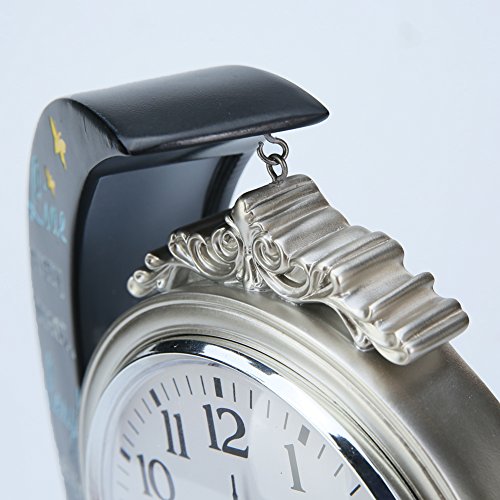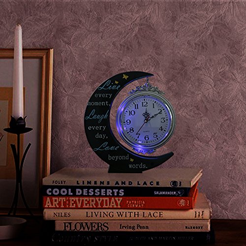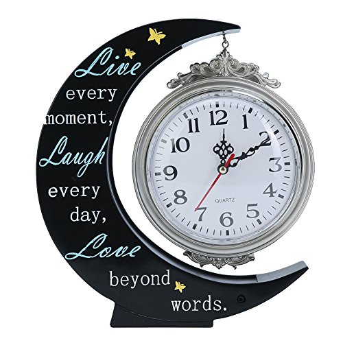 Unique clock decor total size is about 8.5x1.8x9.7 inch(21.5*4.5*24.5cm), clock round face diameter is about 5 inch(12.5cm), round clock face have a hook caught on the body of moon shape clock