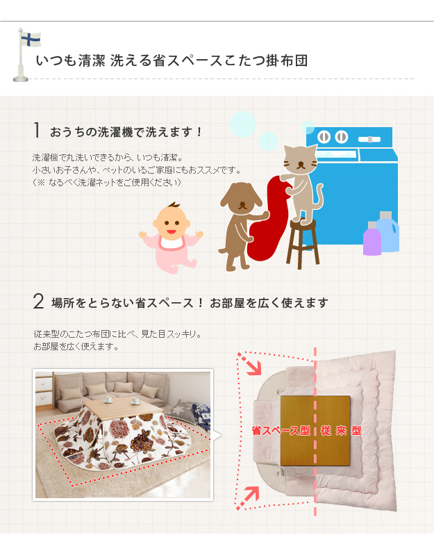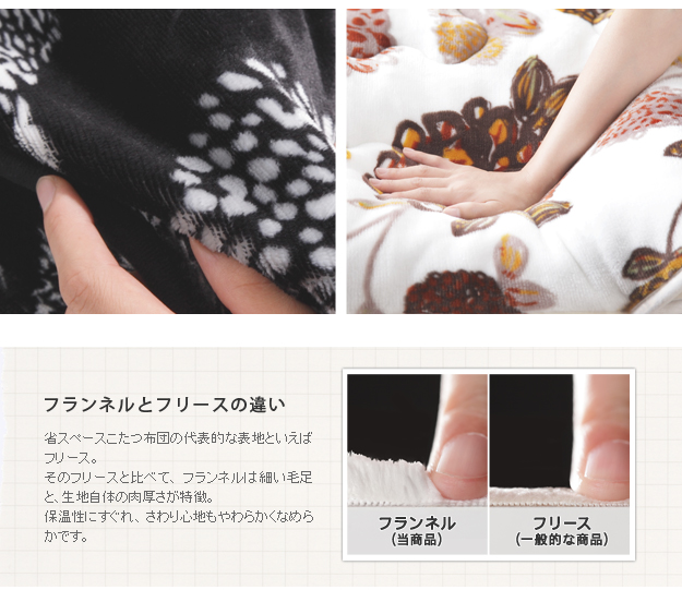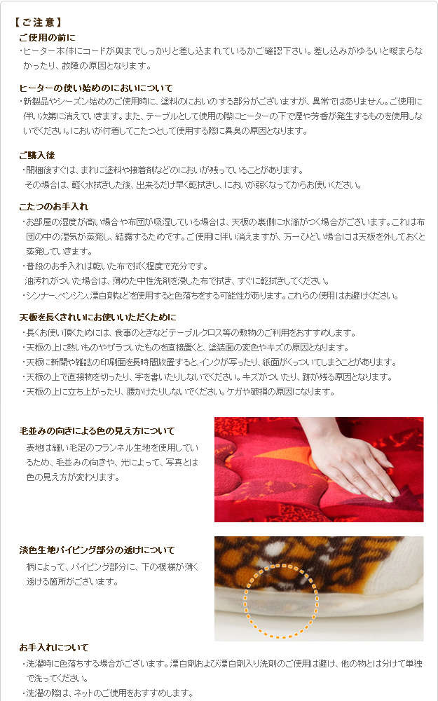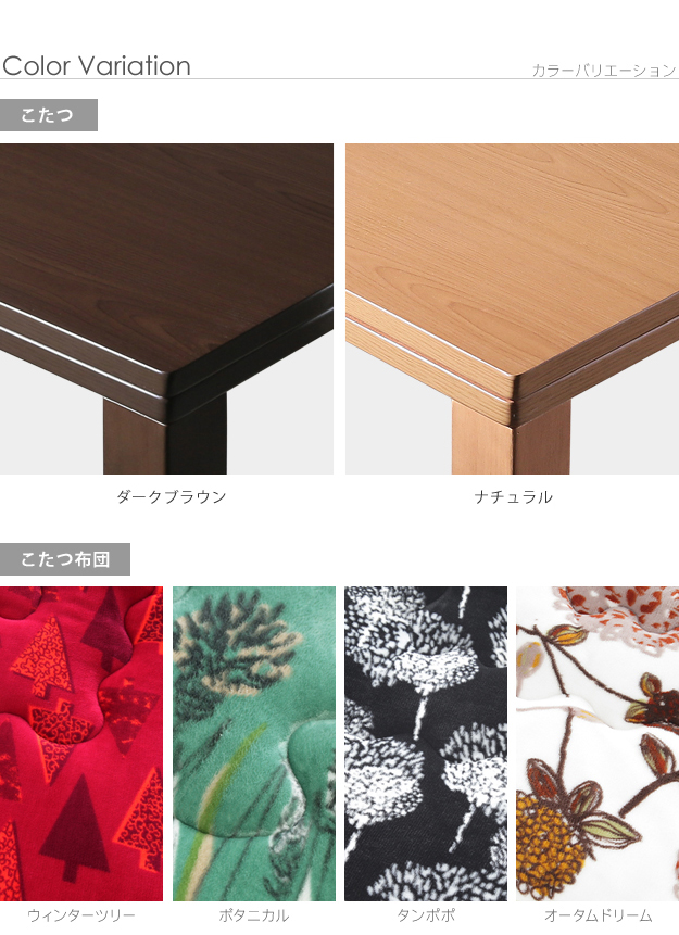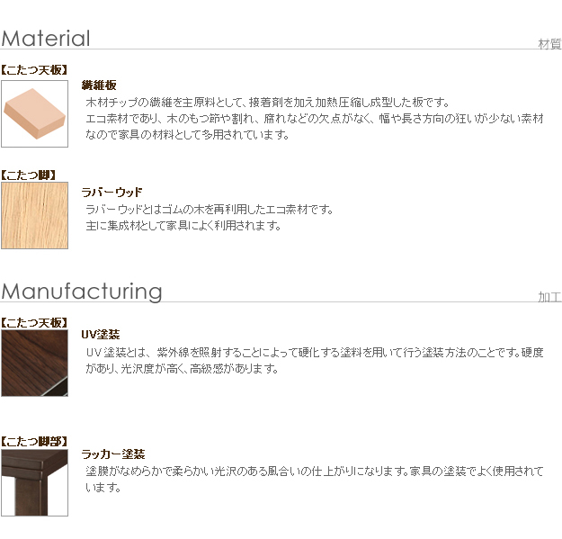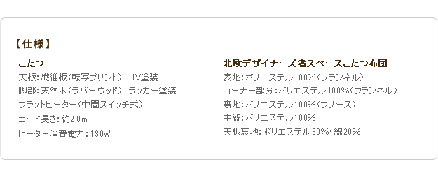 ●材質:こたつ天板-繊維板・UV塗装(オーク柄木目転写)、こたつ脚部-天然木(ラバーウッド)、布団表地・コーナー部-ポリエステル100%(フランネル)、裏地-ポリエステル100%(フリース)、中綿-ポリエステル100%
