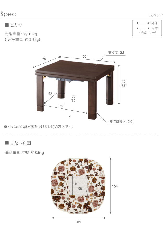 ●サイズ(cm):こたつ-幅60x奥行60x高さ40cm(35+継ぎ脚5cm)・約13kg、布団-164x164cm・中綿量約0.6kg