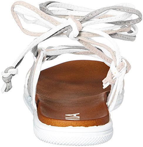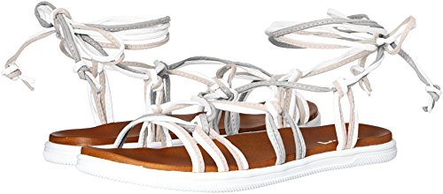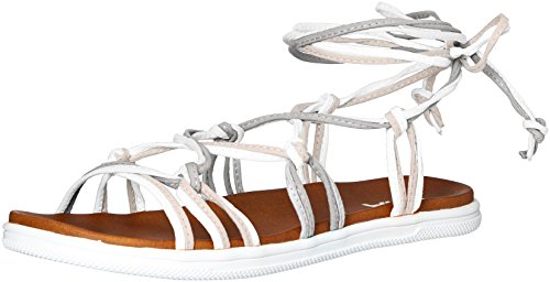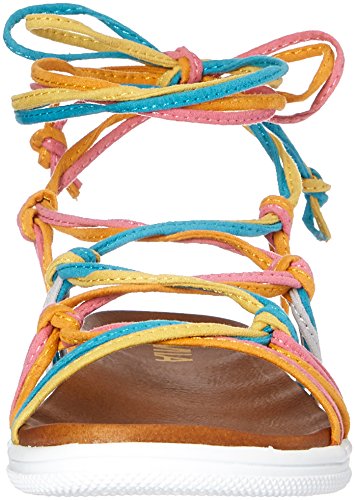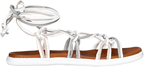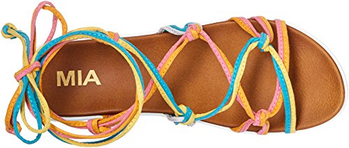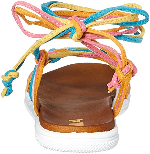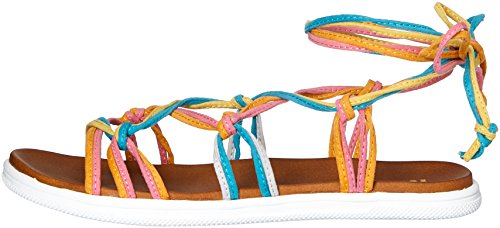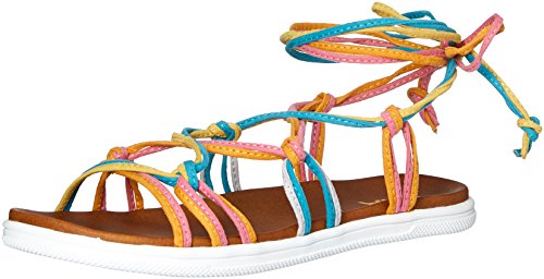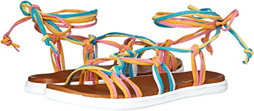 Product DescriptionFlat sandal with multicolored criss-crossed straps that wrap around the ankle for an eye catching effect. features a contoured footbed, flexible sole and a 1.25 inch0