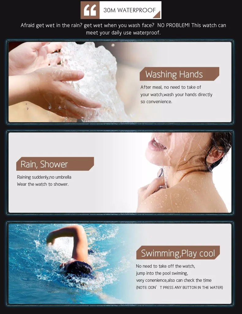 防水性能:30メードル日常防水で、そのままに付けて手を洗い、スポーツしても大丈夫です。(水の中にボタンを調節のはいけません、水に入る恐れがあります)